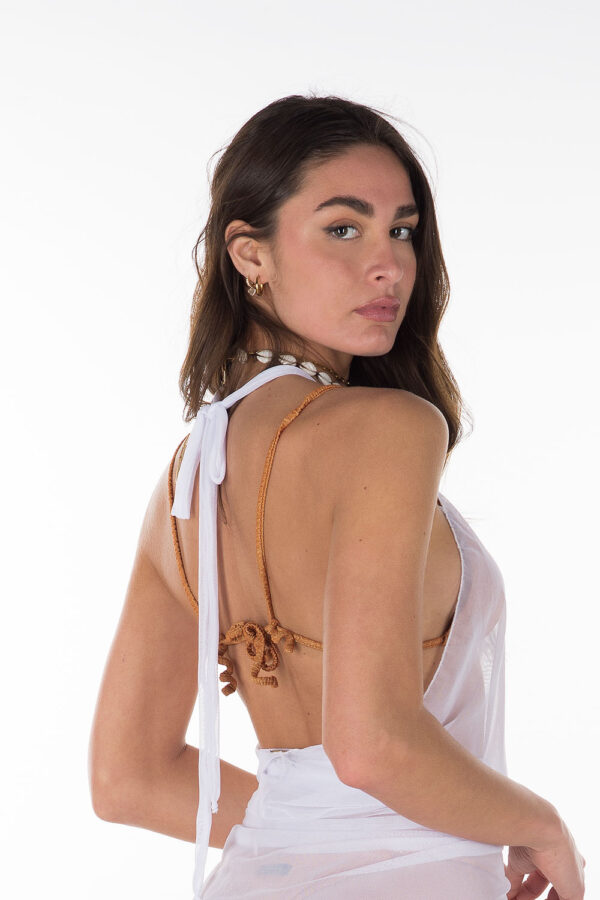 Costume intero ,”trikini”, la parte superiore accompagna il seno seguendo le forme in maniera avvolgente. Il laccetto può essere legato al collo o sulla schiena per un massimo comfort. Lo slip è legato al top da un anello trasparente la parte inferiore è quindi costituita da uno slip regolare ma leggermente sgambato.